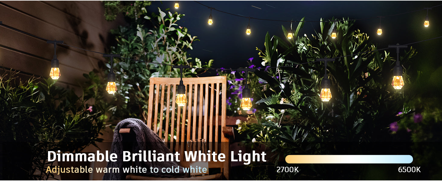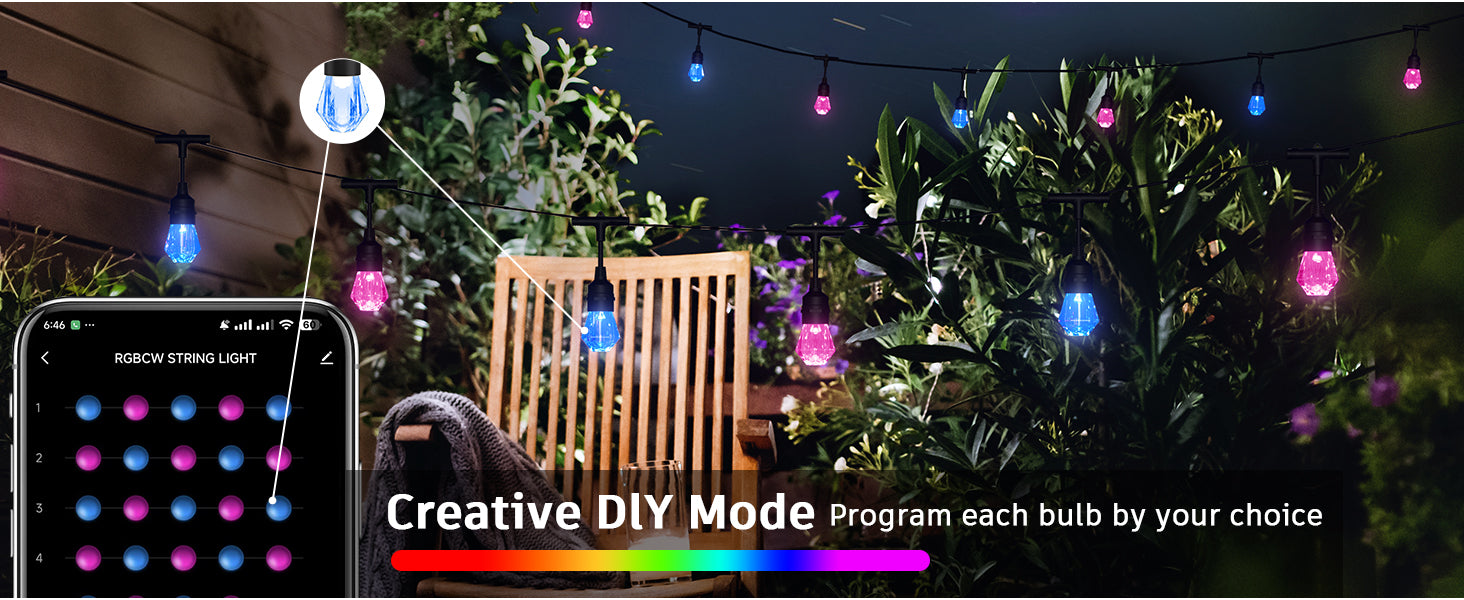 - 【Dynamic RGBCW Light】 The IC-controlled string lights allow each LED bulb can be customized with different colors and adjustable brightness for personalized lighting. The string lights feature replaceable panels (spare LED COB X 2 included)