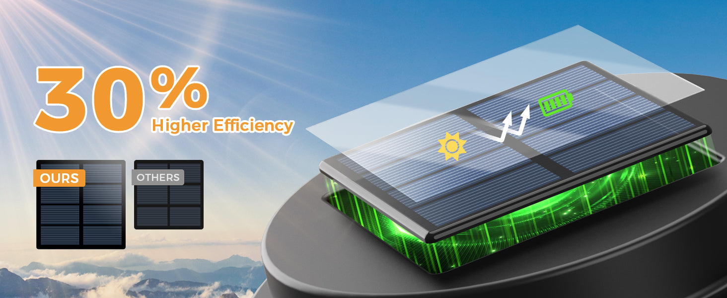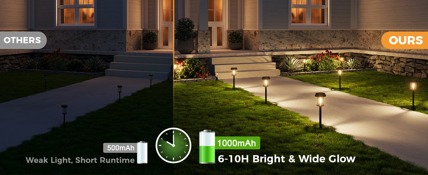 - 30% EFFICIENCY UPGRADE PANEL: Solar garden lights equipped with XL Polycrystalline Panel (2.51" x 2.51") converts sunlight 50% faster - fully charges in 6-8H for 6-10H long-lasting runtime (built-in 1.2Wh high capacity battery). Charged auto in the daytime and working in darkness.
