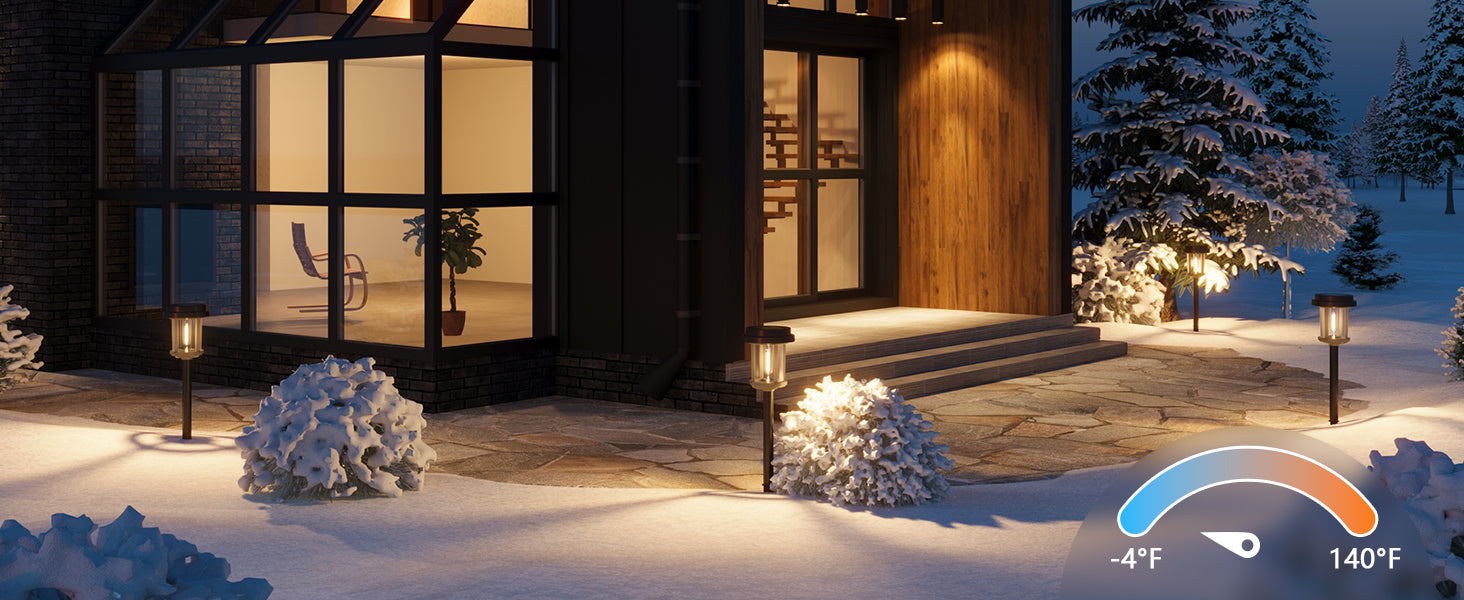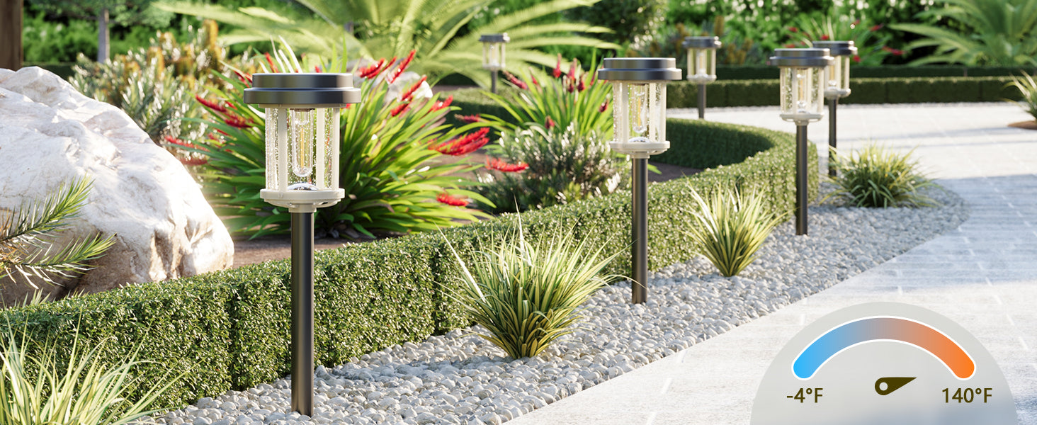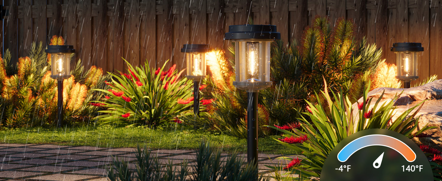 - WEATHER-RESISTANT FOR YEAR-ROUND USE: Solar powered outdoor lights made of high-strength oxidation-resistant metal with bubble lens thickened glass, can withstand -4°F~140 °F. IP65 waterproof grade ensures the solar landscape lights withstands extreme weather conditions.