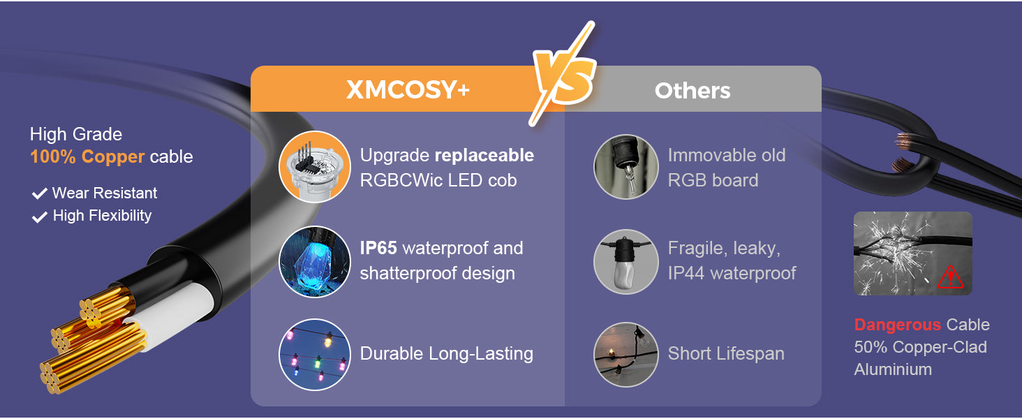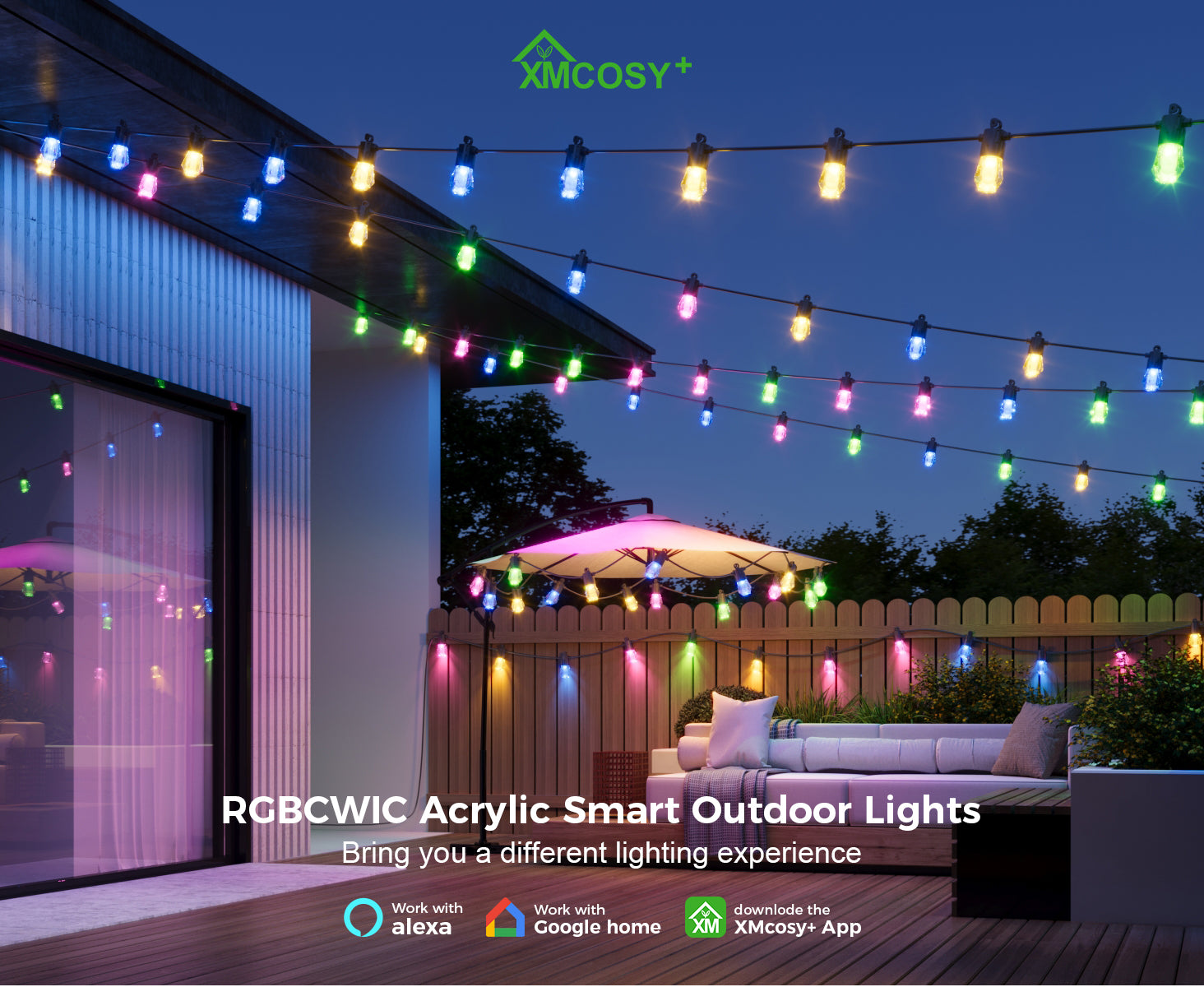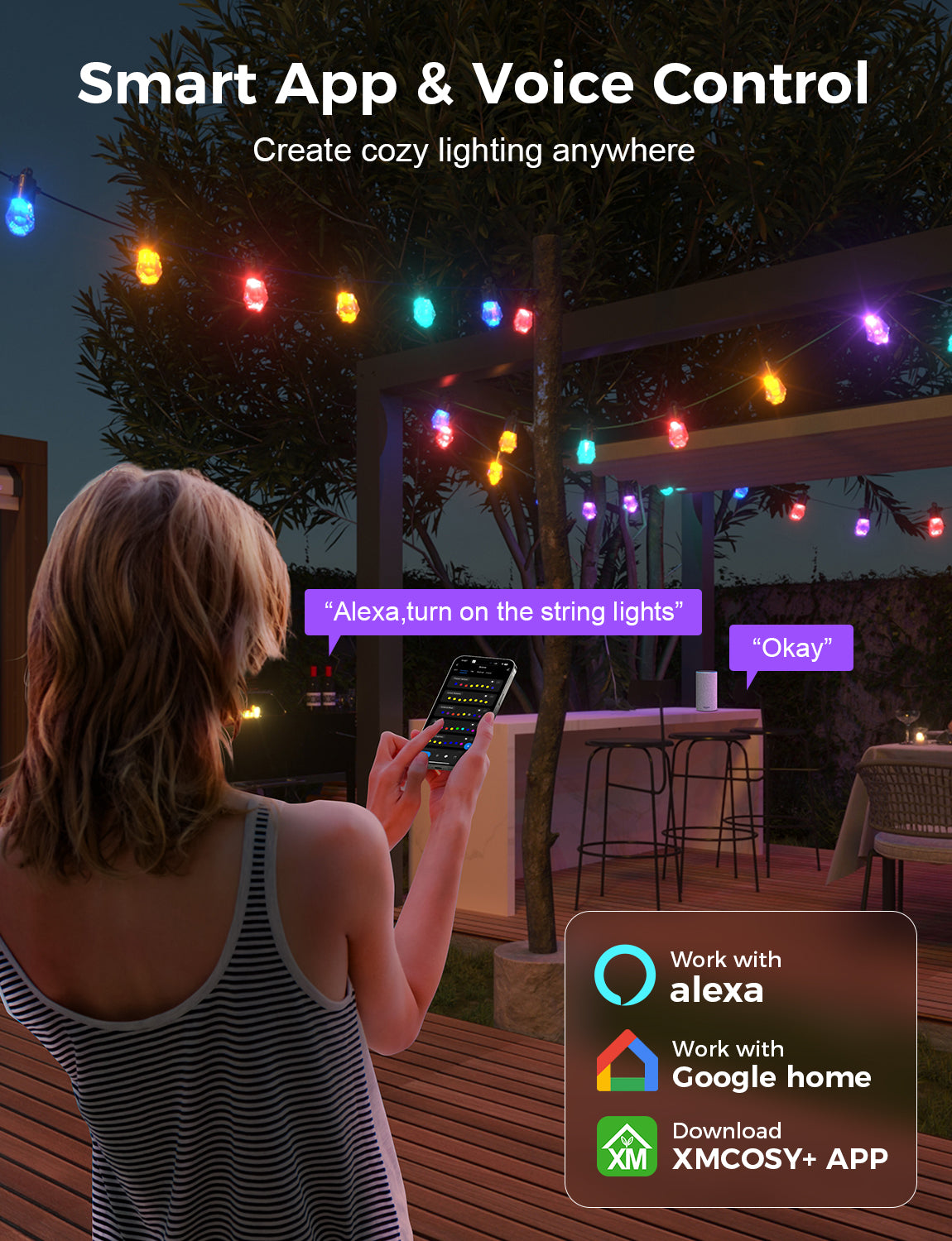 - APP and Voice Control: Using XMcosy APP control the patio lights remotely to create an great decor for a cheerful party or to create a romantic surprise. Pair with Alexa and Google Assistant, turn on or off, set color and brightness with just a command.
