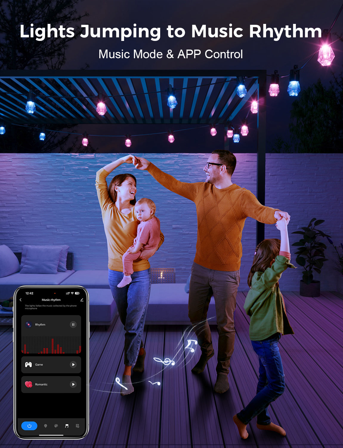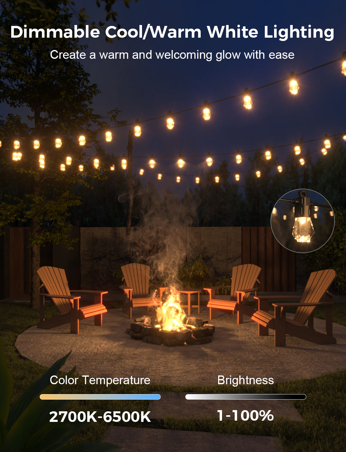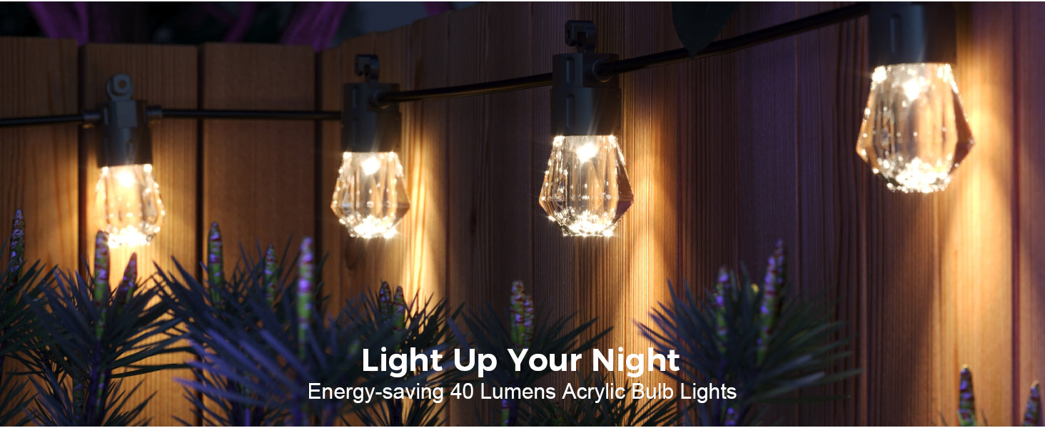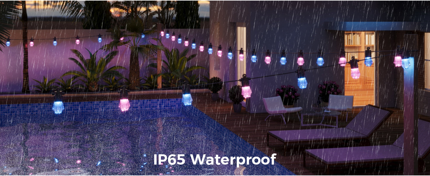 Transform your outdoor space with our RGBCWIC lighting—featuring millions of colors, adjustable brightness, durable acrylic bulbs, smart app and voice control, and music sync capabilities for a vibrant atmosphere perfect for any occasion!