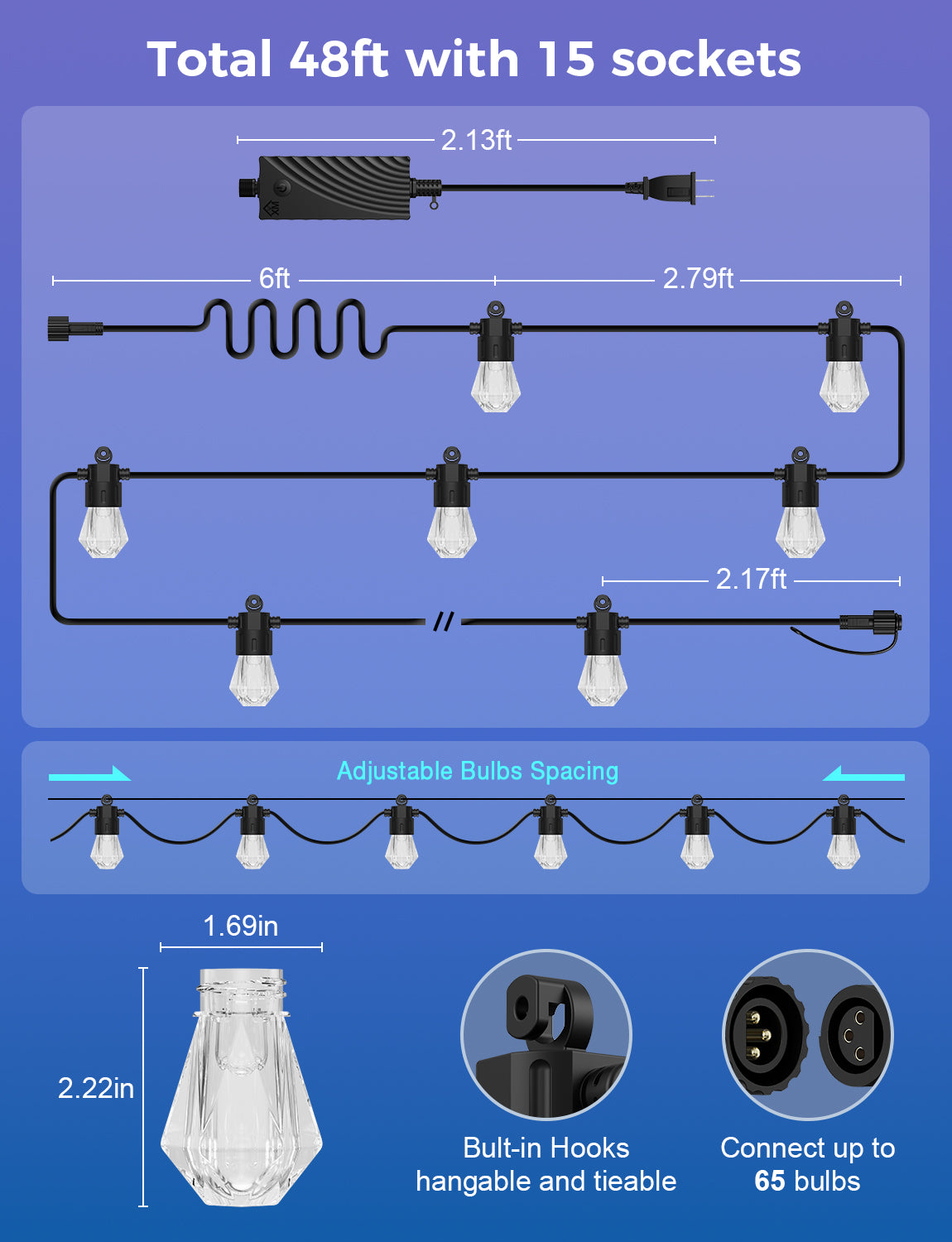 - Connectable: A power adapter support up to 65 bulbs. 48ft string lights come with 15 bulbs, connect up to 4 stands(156ft lighting area). 96ft string lights is a complete set, come with 30 bulbs, connect up to 2 strands(168ft lighting area)!