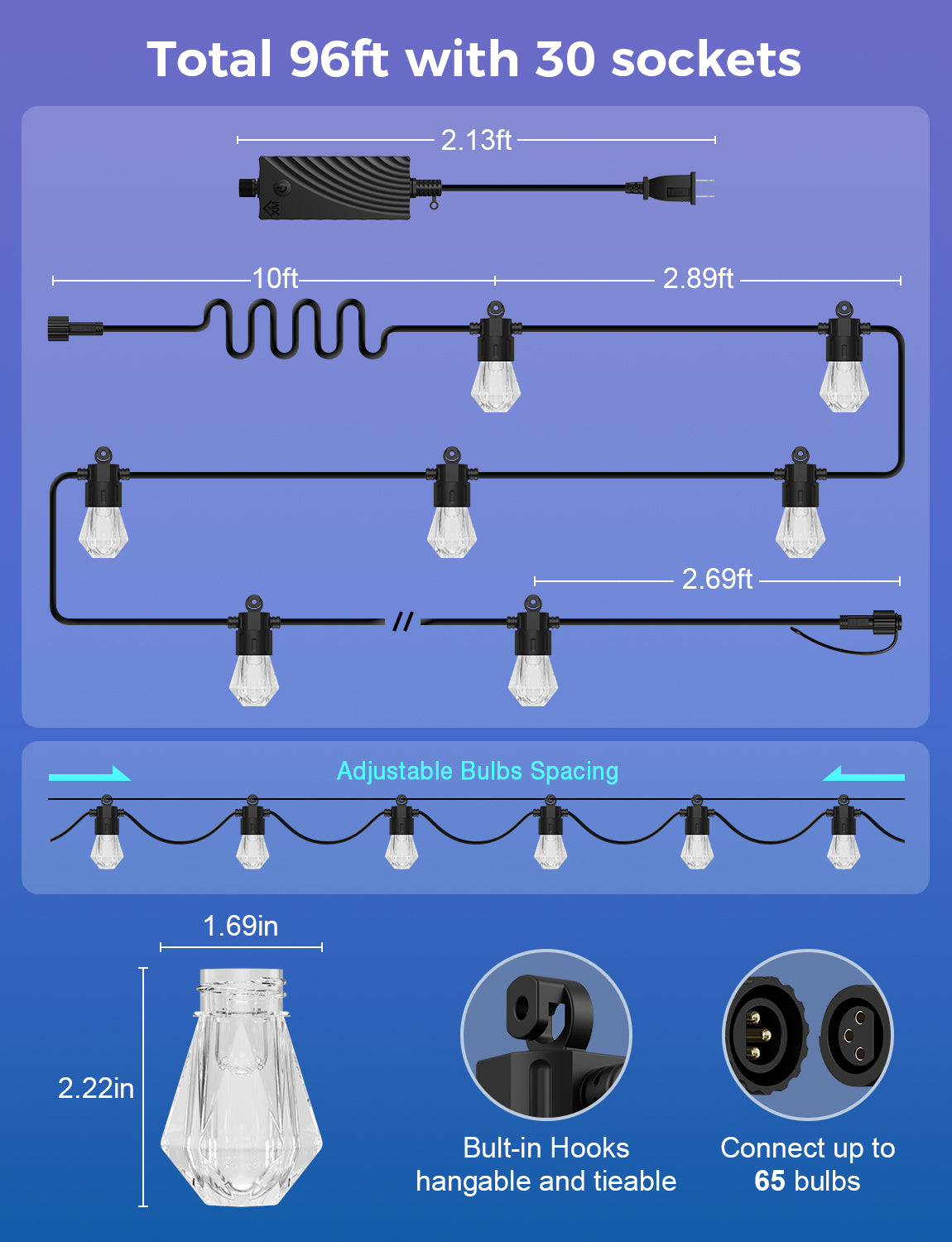 - Long Extension Cord: The 48ft string lights feature a 6ft plug section, while the 96ft string lights come with a 10ft plug section.