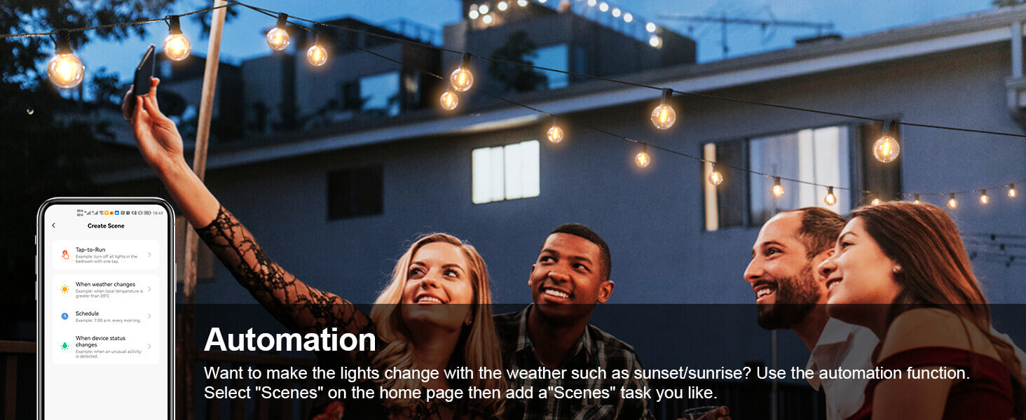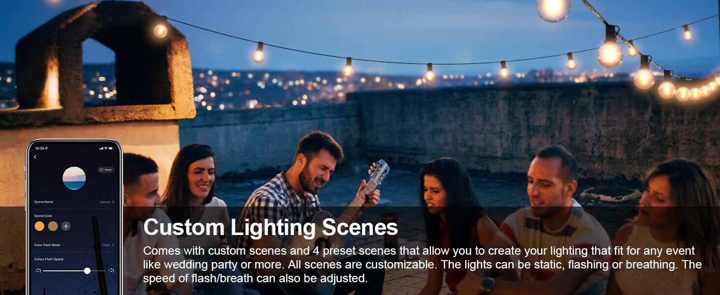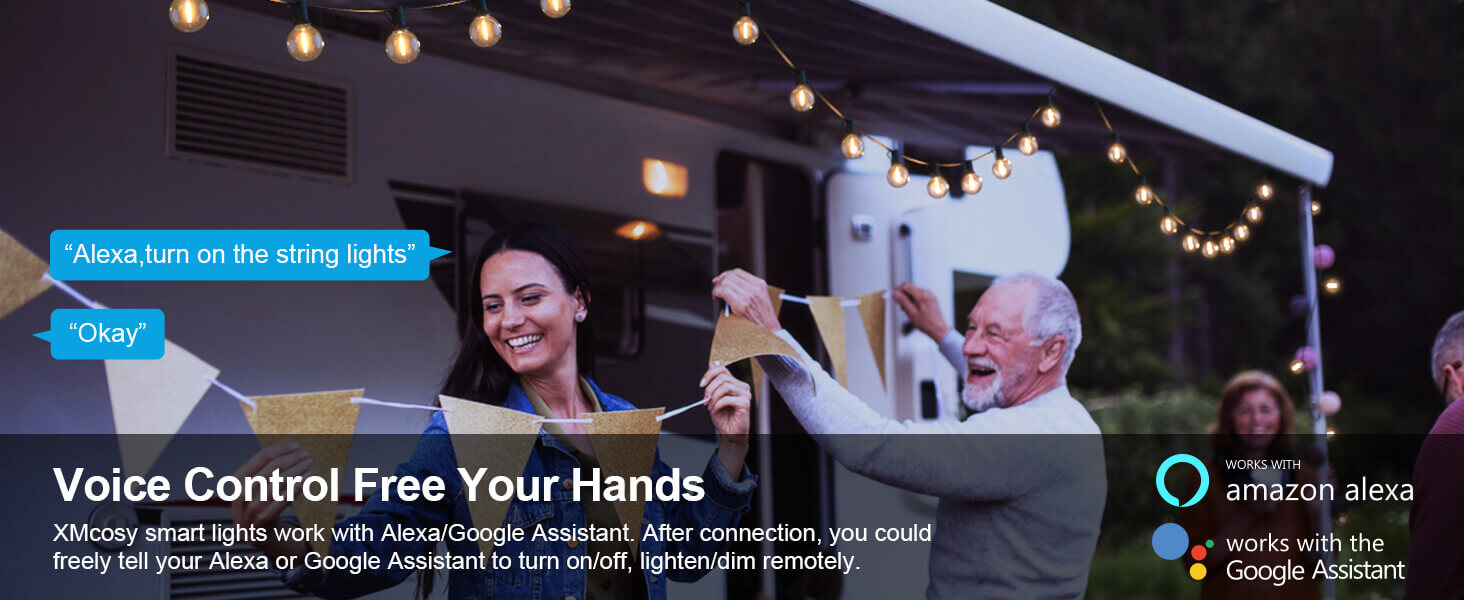 • [App & Intelligent Voice Control] XMcosy string lights remote controlled by XMcosy App. You can easy to control it anytime, anywhere. Brightness 1-100% dimmable for greater lighting flexibility and cozy glow. Built-in scenes/customizable scenes with adjustable breathing and flashing lighting-effect. This outdoor patio lights work with Alexa and other intelligent voice assistants.