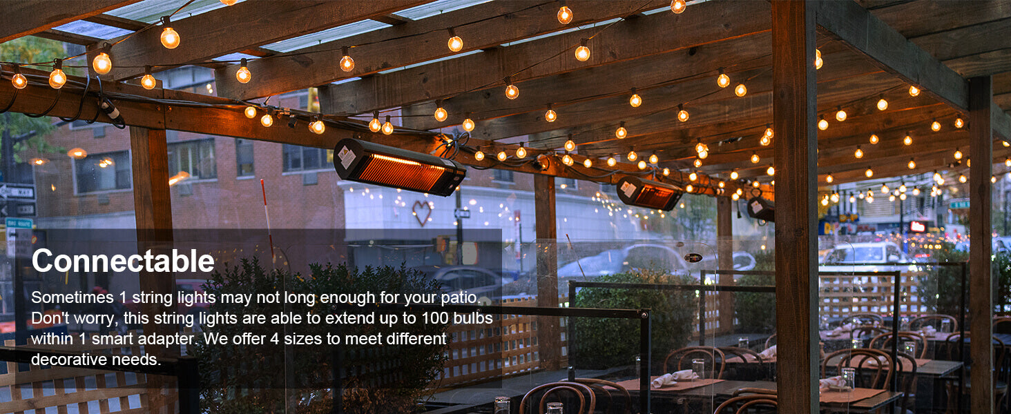 • [Weatherproof & Shatterproof] The G40 LED outdoor string lights are certificated weatherproof and shatterproof. ETL listed commercial grade make our patio string lights durable enough to withstand awful weather unrestricted. Hanging string lights for patio, pergola, gazebo, canopy, porch, garden, courtyard, party even indoor like café and bedroom.