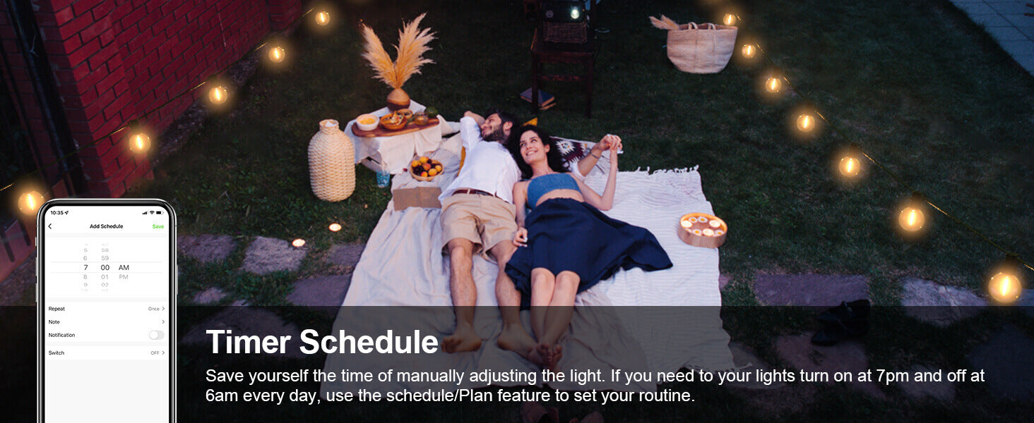 • You could dimmable brightness, set light scenes, timer switch, even group control multiple smart devices or family member device sharing.