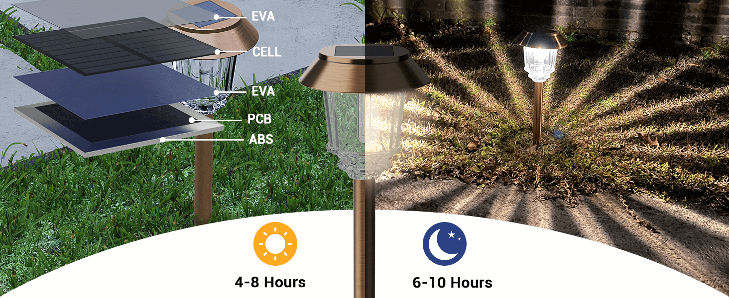 - Eco-friendly & 360° solar powered: solar lights outdoor garden guarantee to continue working for 6 -12 hours up to a whole night.