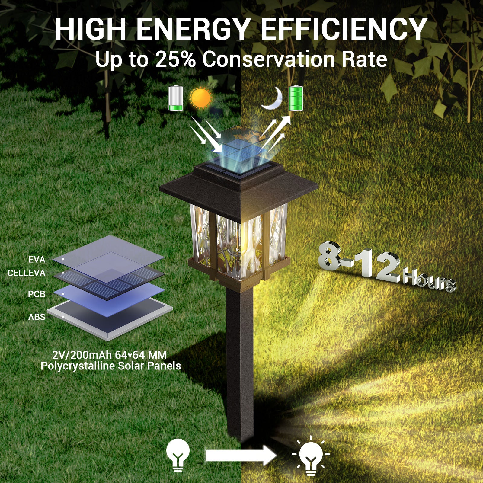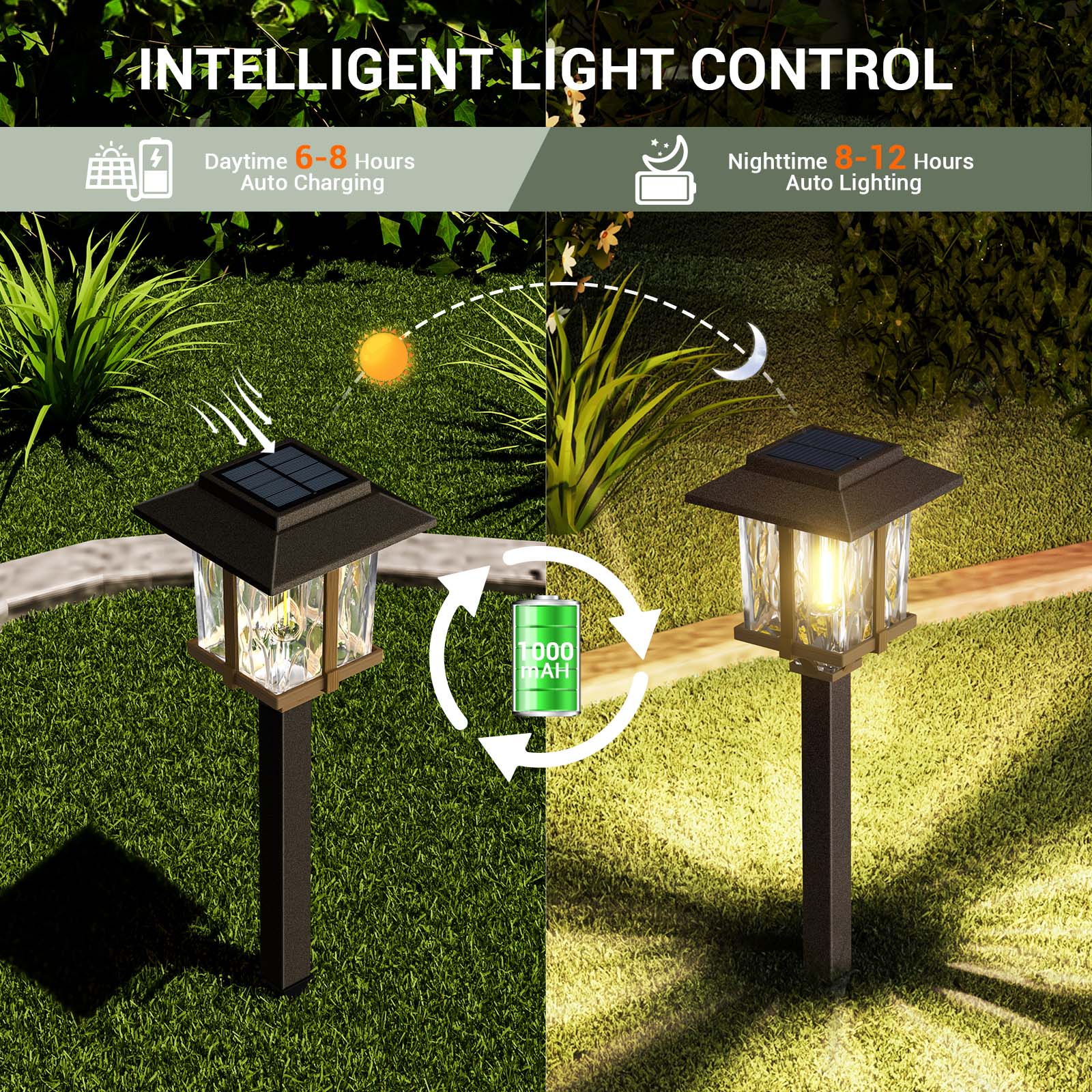 - Dusk to Dawn Lighting & High Capacity Battery: Crystalline solar panel and higher capacity rechargeable battery means our solar outdoor lights can effectively absorb more sunlight and converts it into electricity. Fully charged the 1.2V 1000mAh NI-MH AA rechargeable battery capacity (included) for 4-6 hours in the day and converted sunlight into electricity, which conserves battery life for continuous nighttime 15 lumens' illumination for up to 8-10 hours running time.