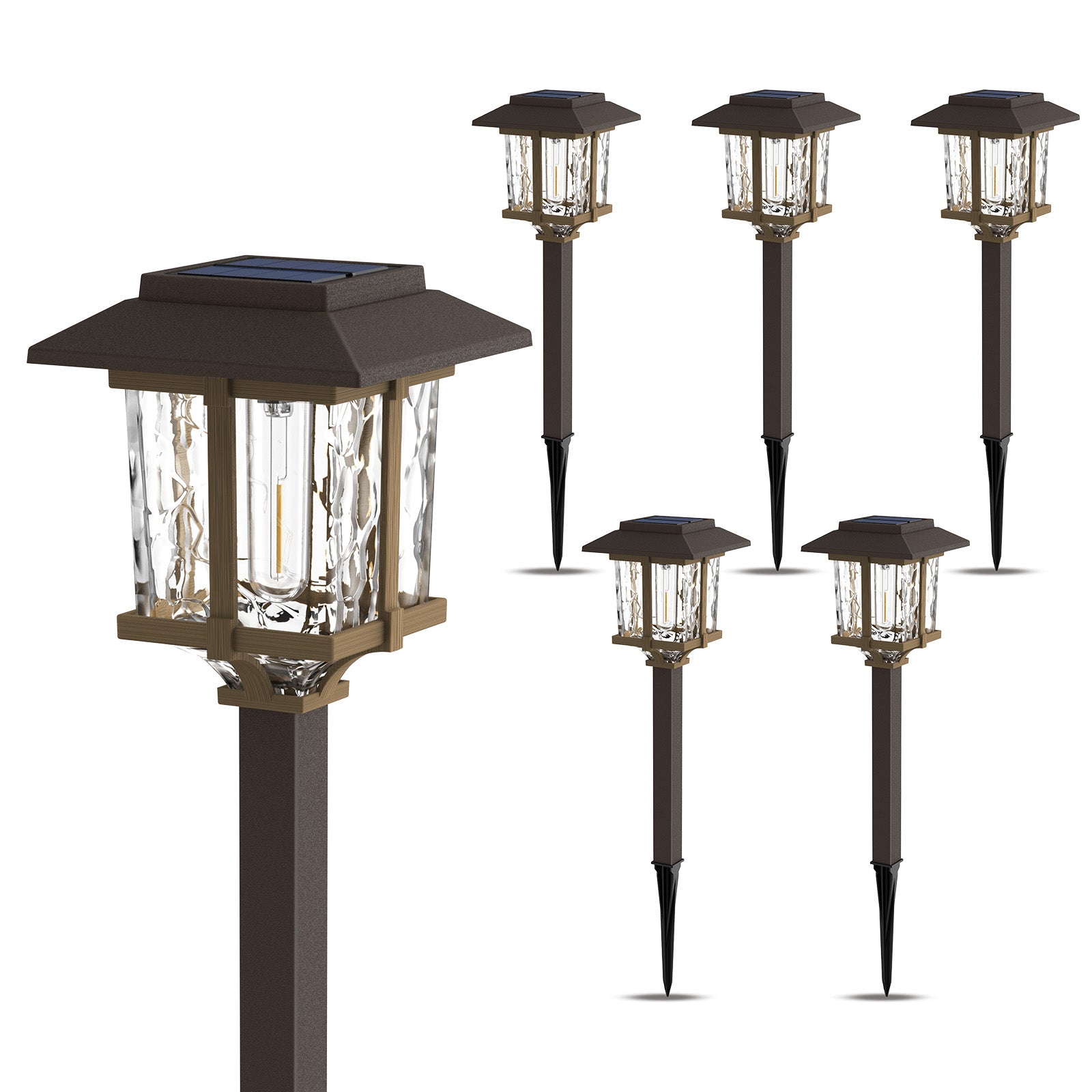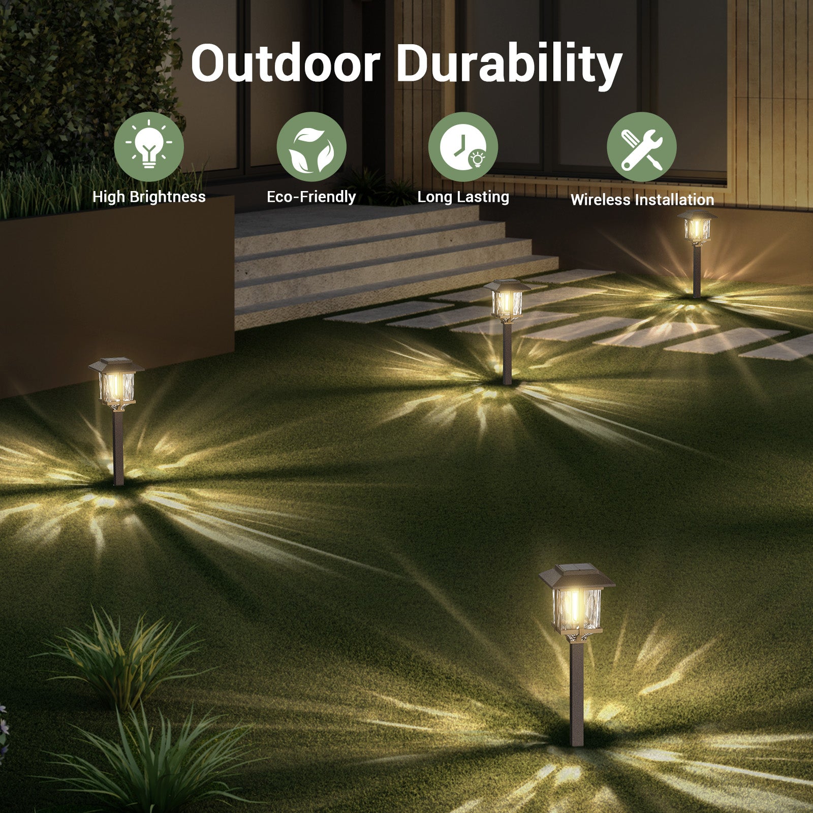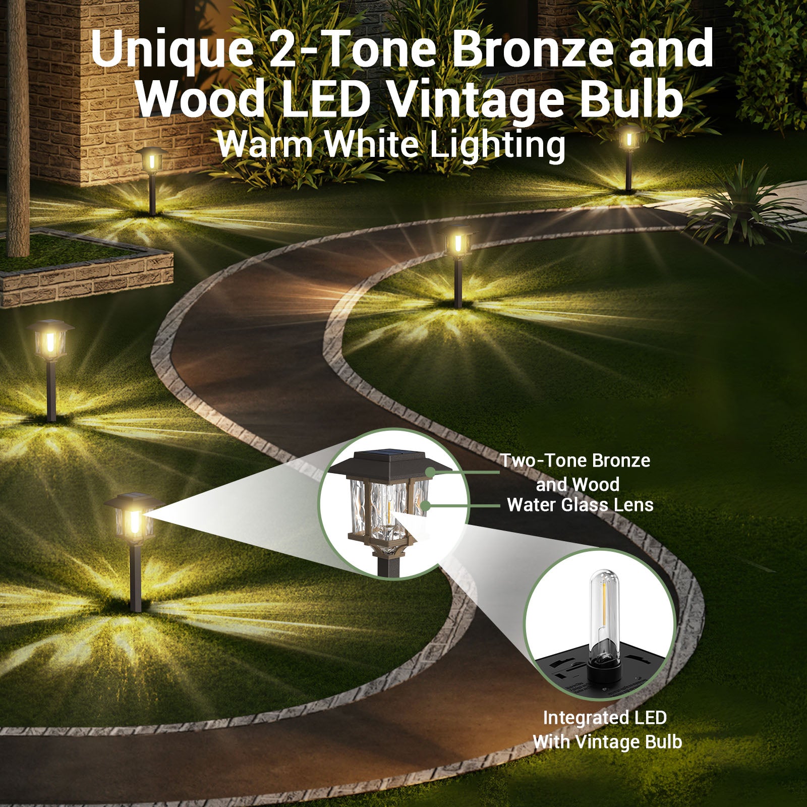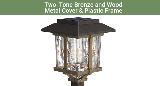 - Innovative Elegant Design & Attractive Illumination Pattern: Two-tone bronze and wood Solar Outdoor Pathway Lights feature a high transmittance water glass lens, integrated LED with vintage bulb, and stainless steel & plastic construction for a beautiful warm white lighting effect and attractive pattern on your walkway, which makes our solar lights brighter than ordinary solar path lights.
