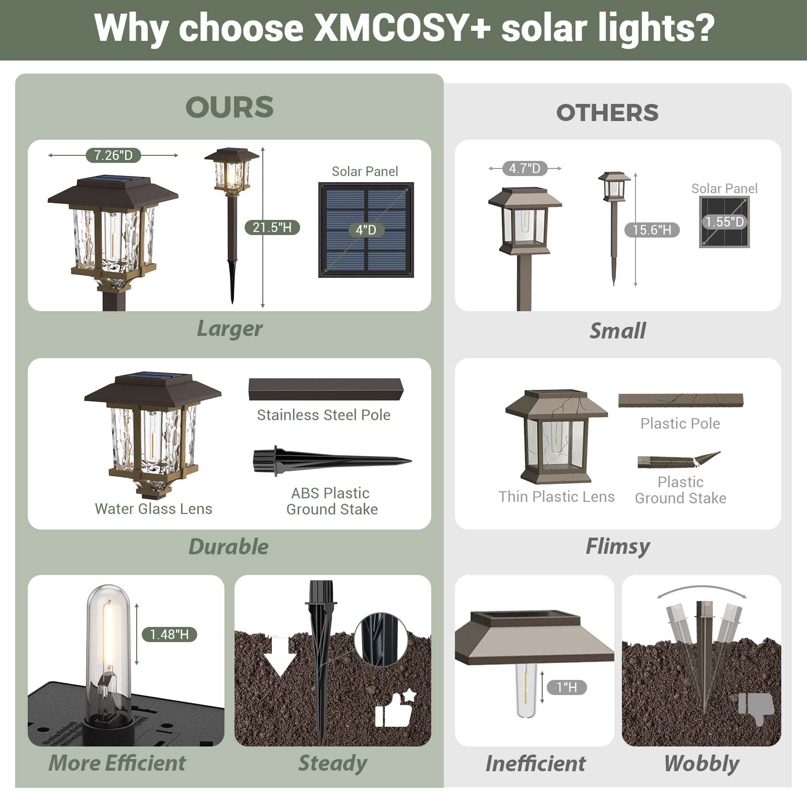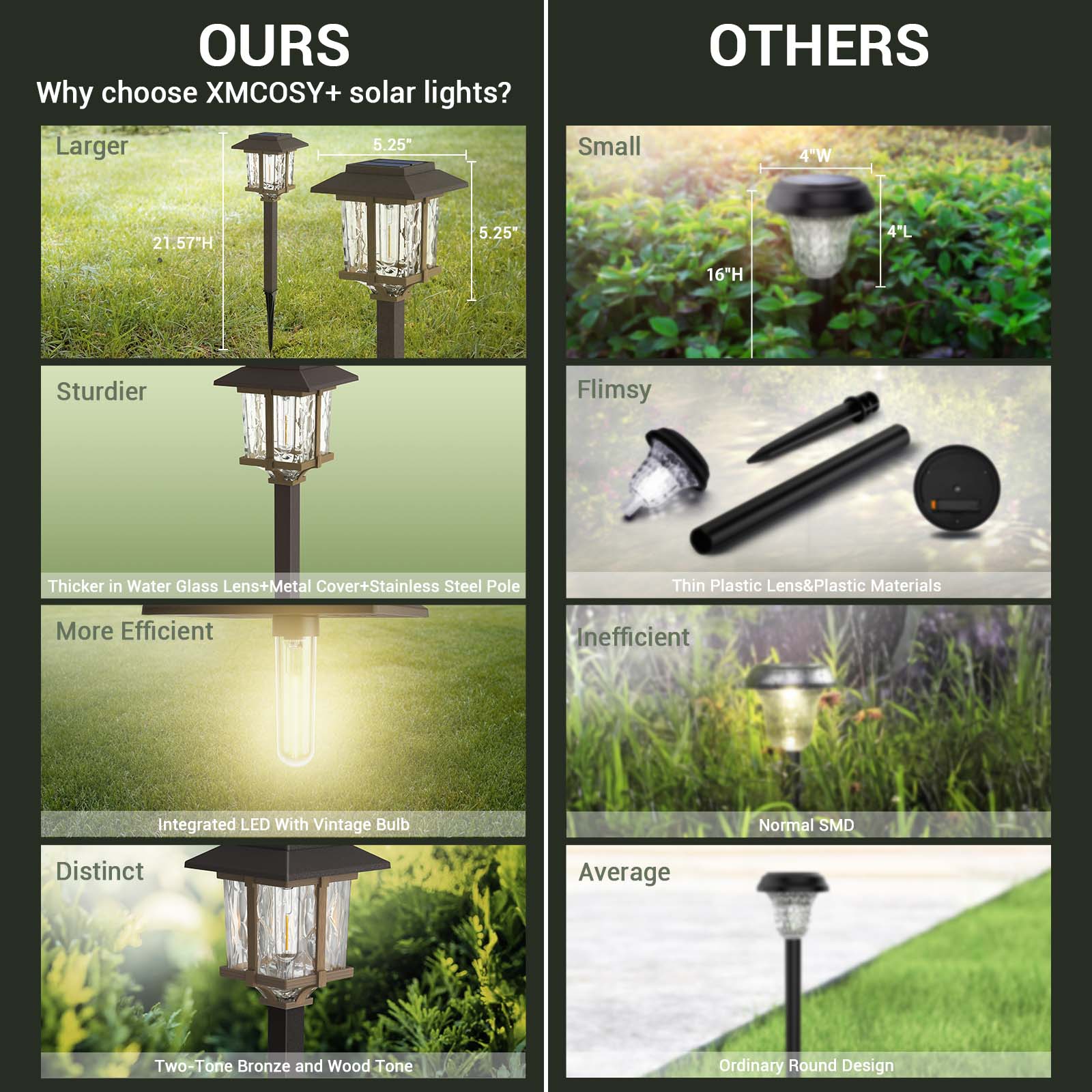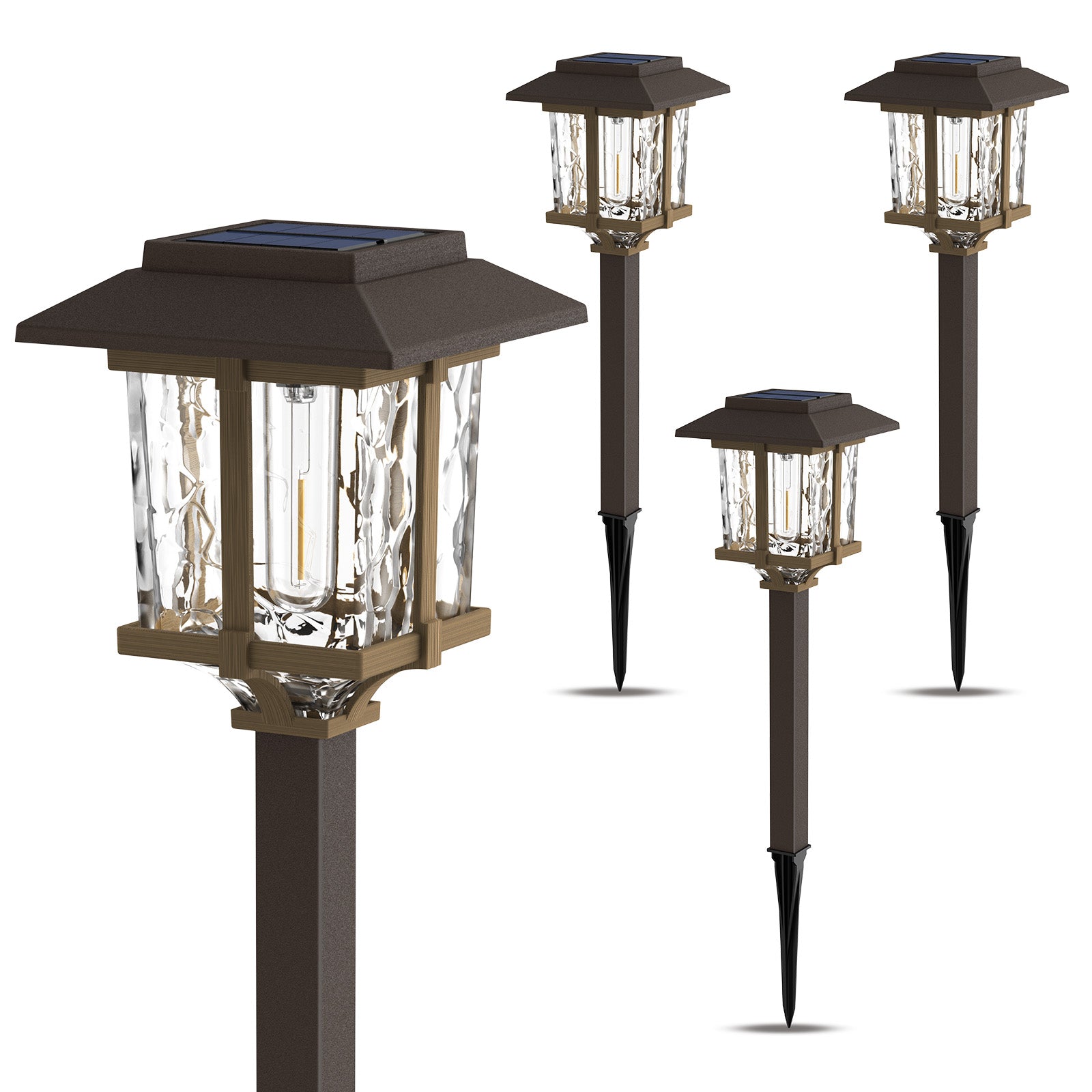 - Innovative Elegant Design & Attractive Illumination Pattern: Two-tone bronze and wood Solar Outdoor Pathway Lights feature a high transmittance water glass lens, integrated LED with vintage bulb, and stainless steel & plastic construction for a beautiful warm white lighting effect and attractive pattern on your walkway, which makes our solar lights brighter than ordinary solar path lights.