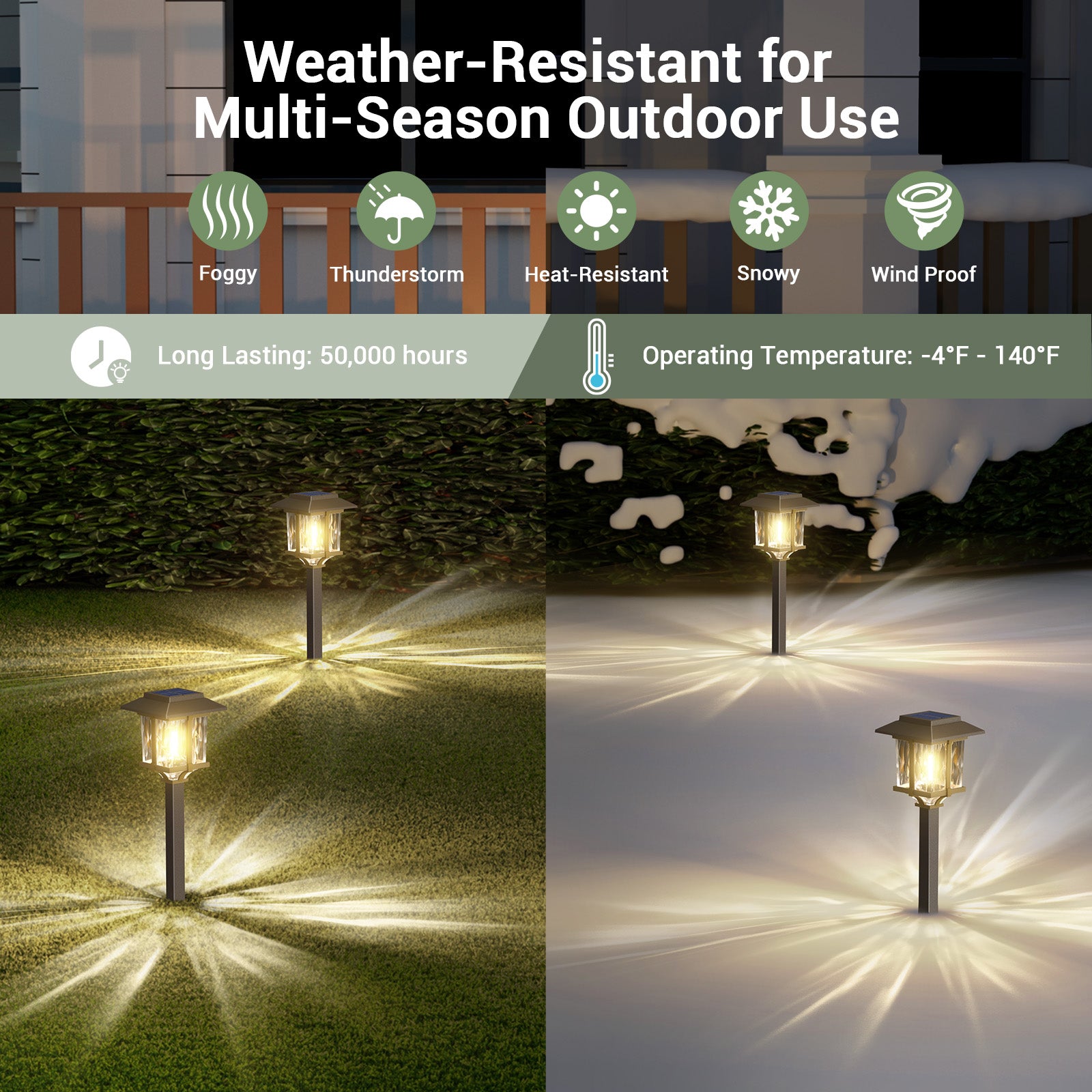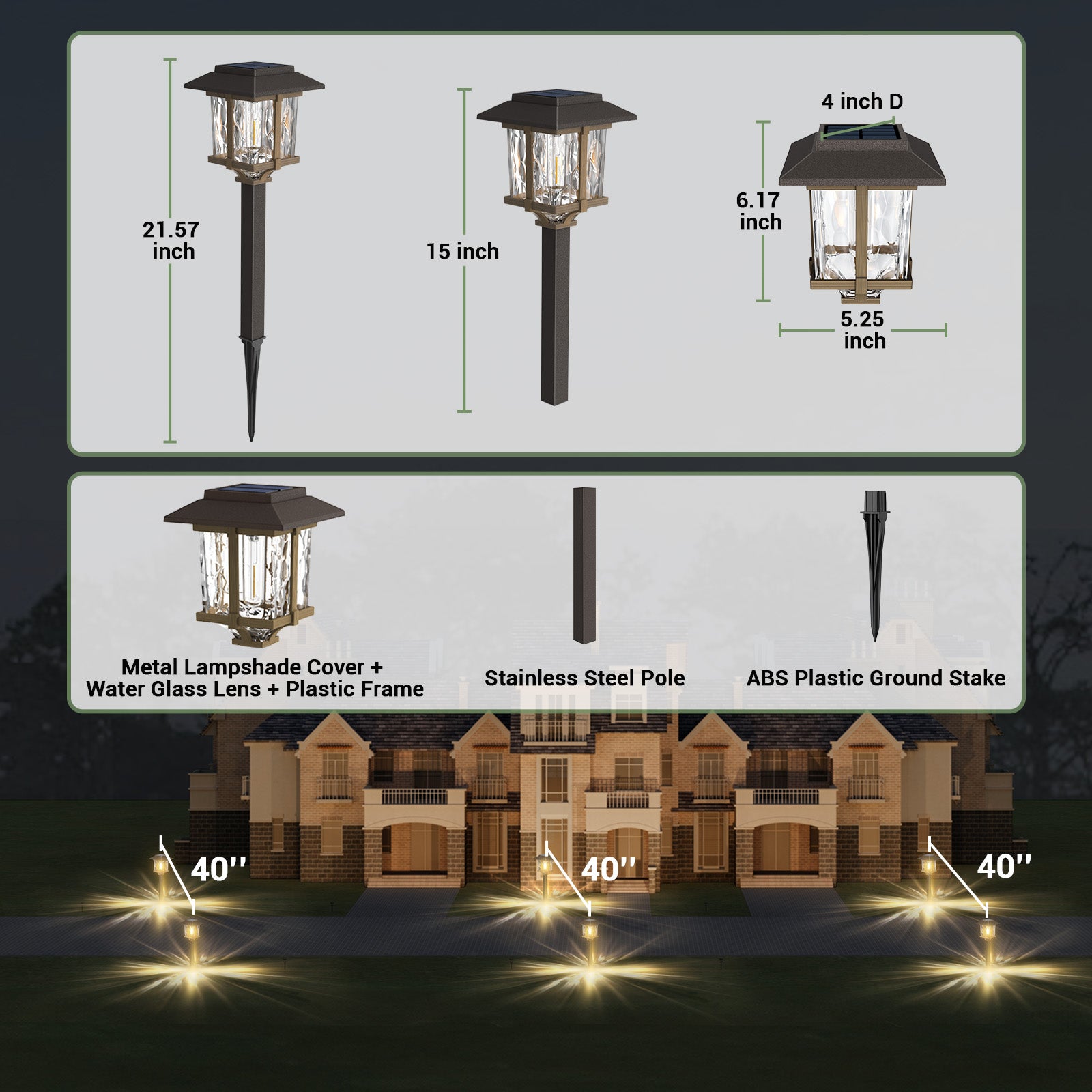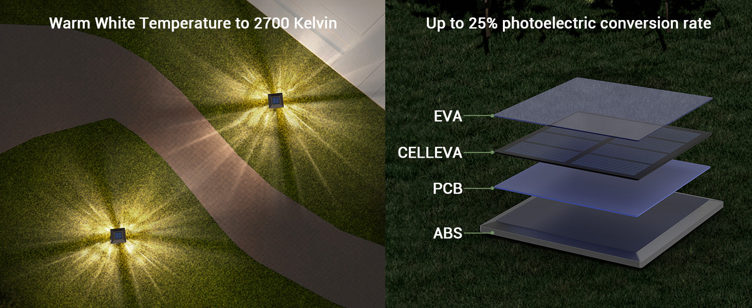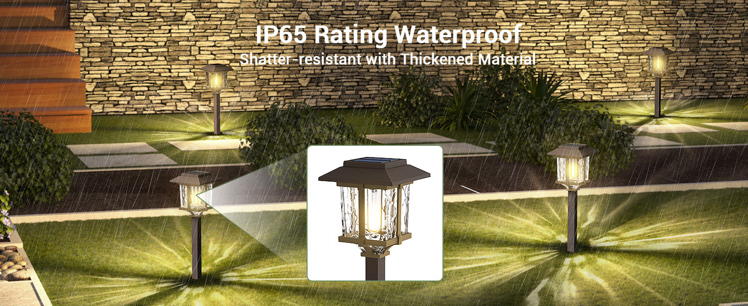- Weather-resistant & IP65 Waterproof: Built to withstand outdoor elements - Made of durable Stainless Steel material, the crystalline solar panel, ensures the walkway solar lights outdoor waterproof and can stand up to the bad weather for multi-season outdoor use. It's specifically designed to withstand extreme weather conditions. Corrosion-resistant stainless steel, with a robust ABS plastic ground stake, which builds the solar pathway lights waterproof, and sturdy. Product Size: 5.25"*5.25"*22" Height (including ground insertion).