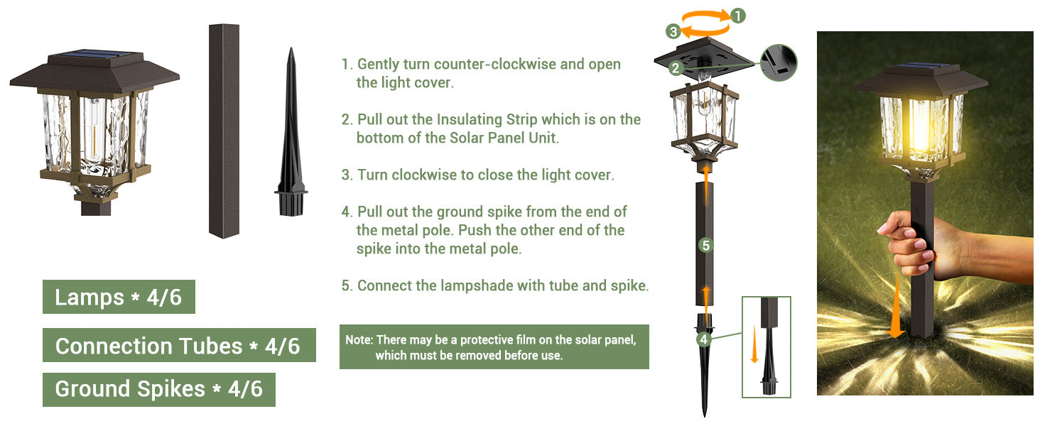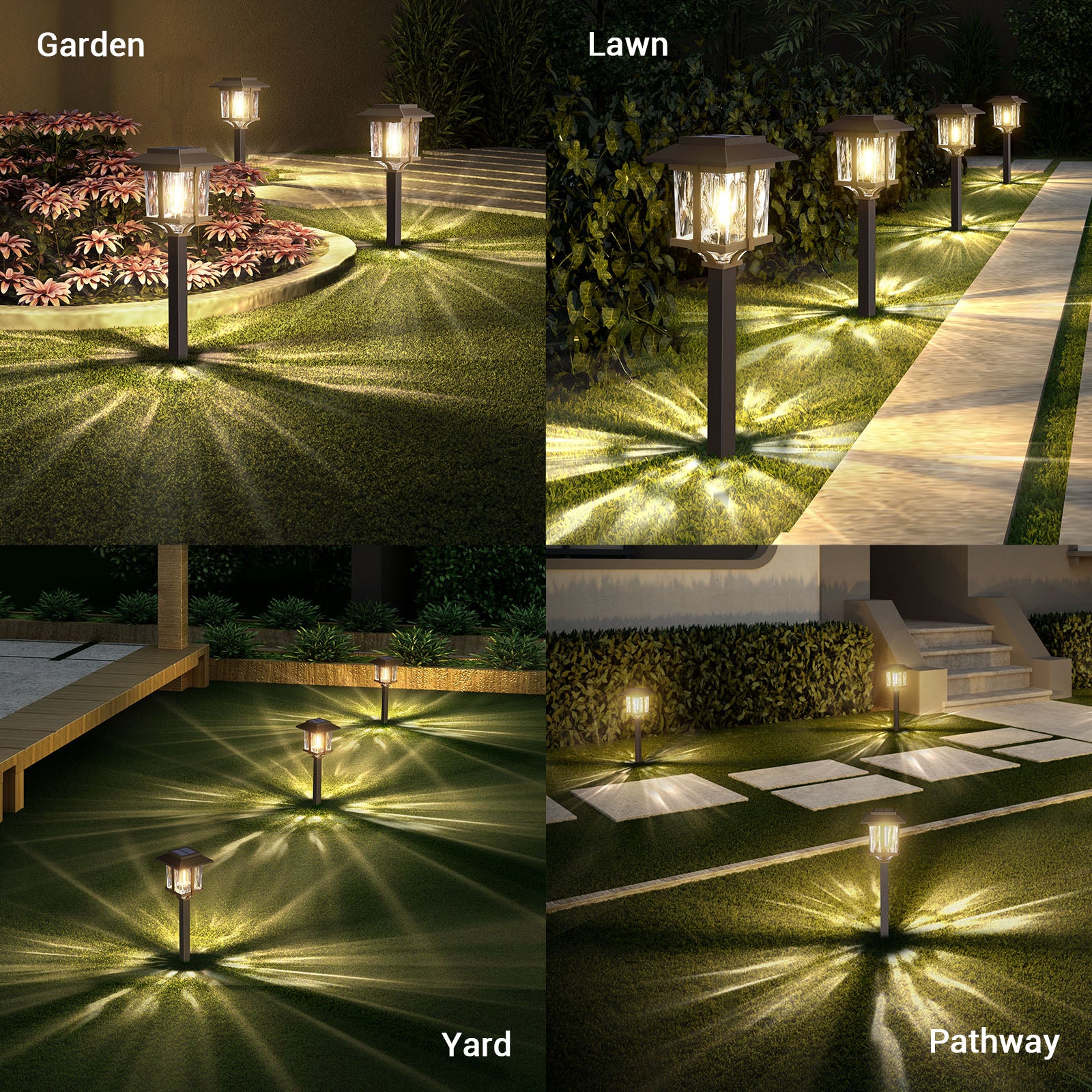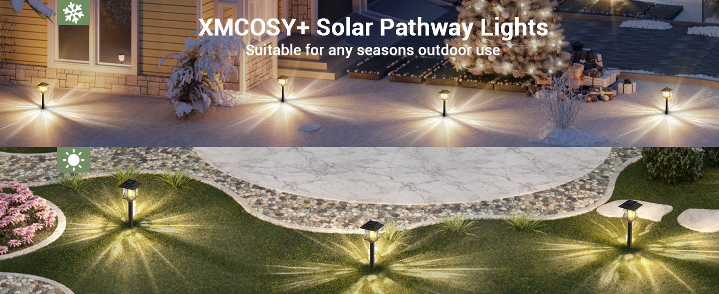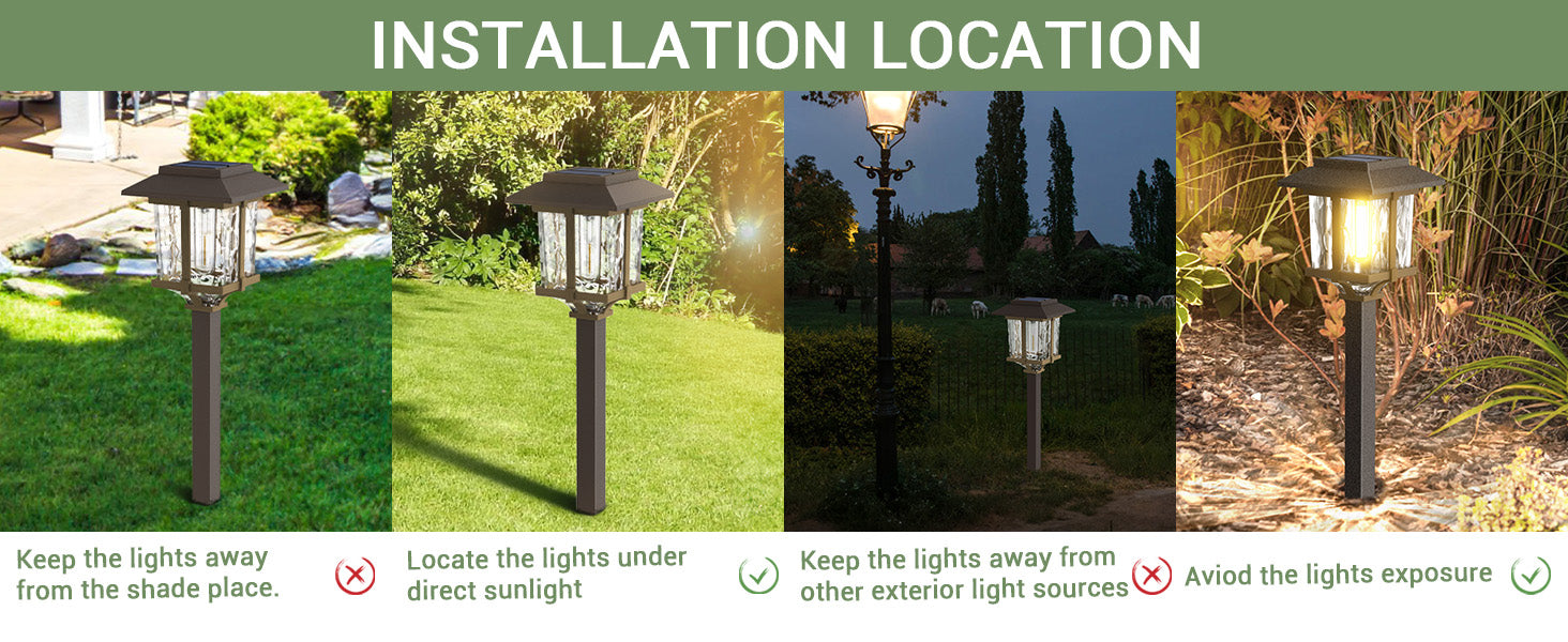 - Simple installation & Wide applications: With no wiring necessary and LED bulbs, these solar path lights are easily installed and practically maintenance free, just stake into the ground wherever the sunshine is. Perfect for creating the illuminating nighttime scene with your family, friends, or neighbors walking on walkways, driveways, gardens, lawns, patios, pathways, decks, and courtyards. Enhance your home's charming and elegant landscape, while increasing safety during the nighttime hours.