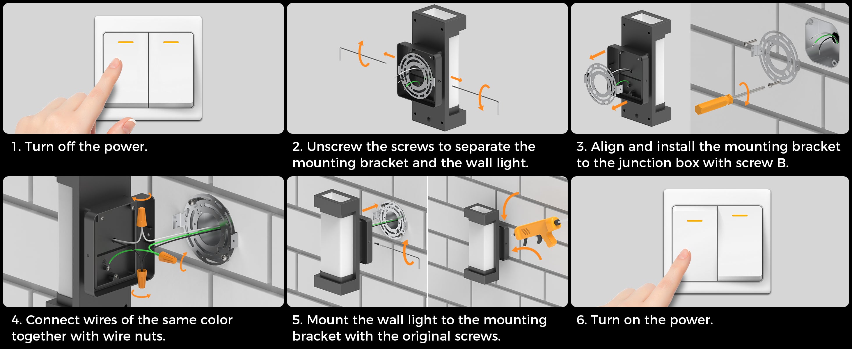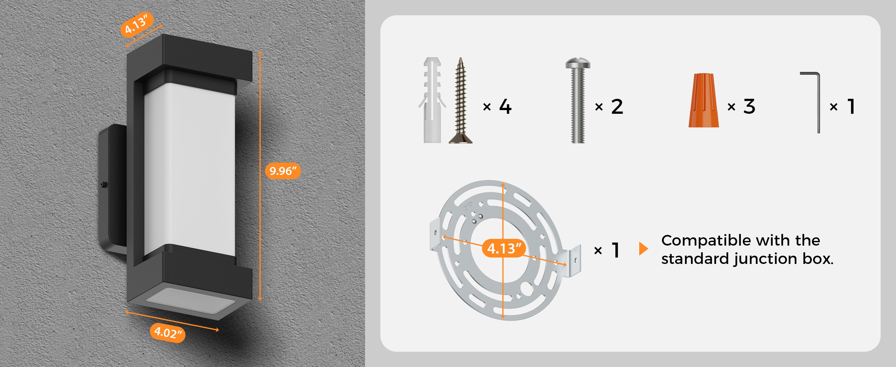 - 🔌Easy Installation: Designed to fit standard electrical boxes and hard-wired, these outdoor light fixtures wall mount can be easily installed. With all installation parts of the 2 types screws for 2 install ways, wire nut, mounting Bracket, and arm hex key, you don't need to purchase any other accessories to install.