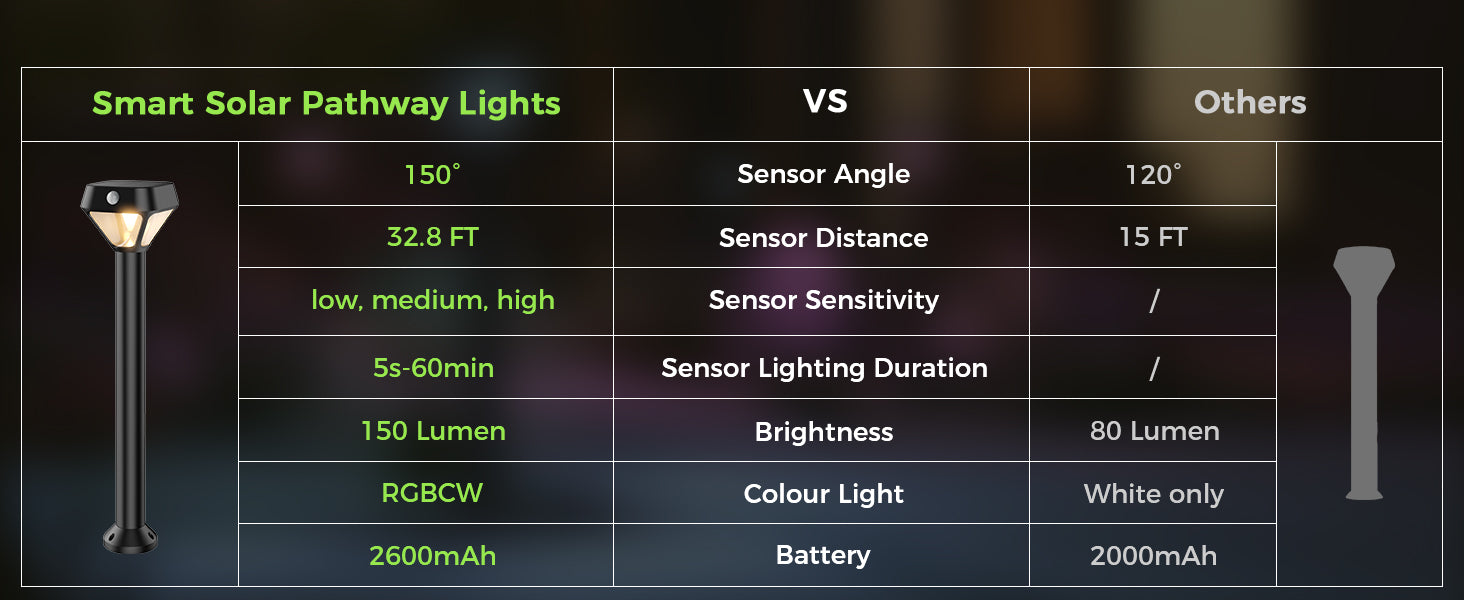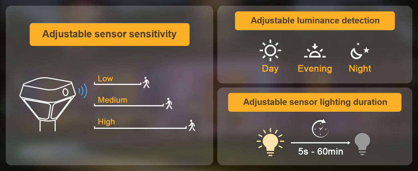 - High Sensitivity Motion Detection: Advanced PIR sensor detects movement within 32.8ft range & 150° coverage. this light offers adjustable sensitivity, brightness (1-100%), and light duration (5s-60min). Perfect security light for gardens, yards, pathway and driveways so on.