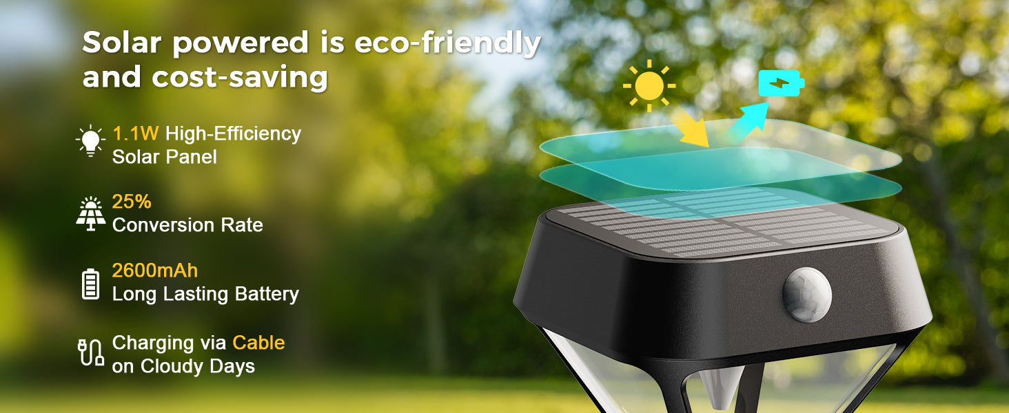 - High-Efficiency Solar Power and High-capacity Battery: Equipped with a 1.1W monocrystalline silicon solar panel, the photovoltaic conversion rate is as high as 25%, with a built-in 2600mAh battery, and also equipped with a usb charging cable, which allows you to keep charging even on cloudy days to ensure all-weather use.