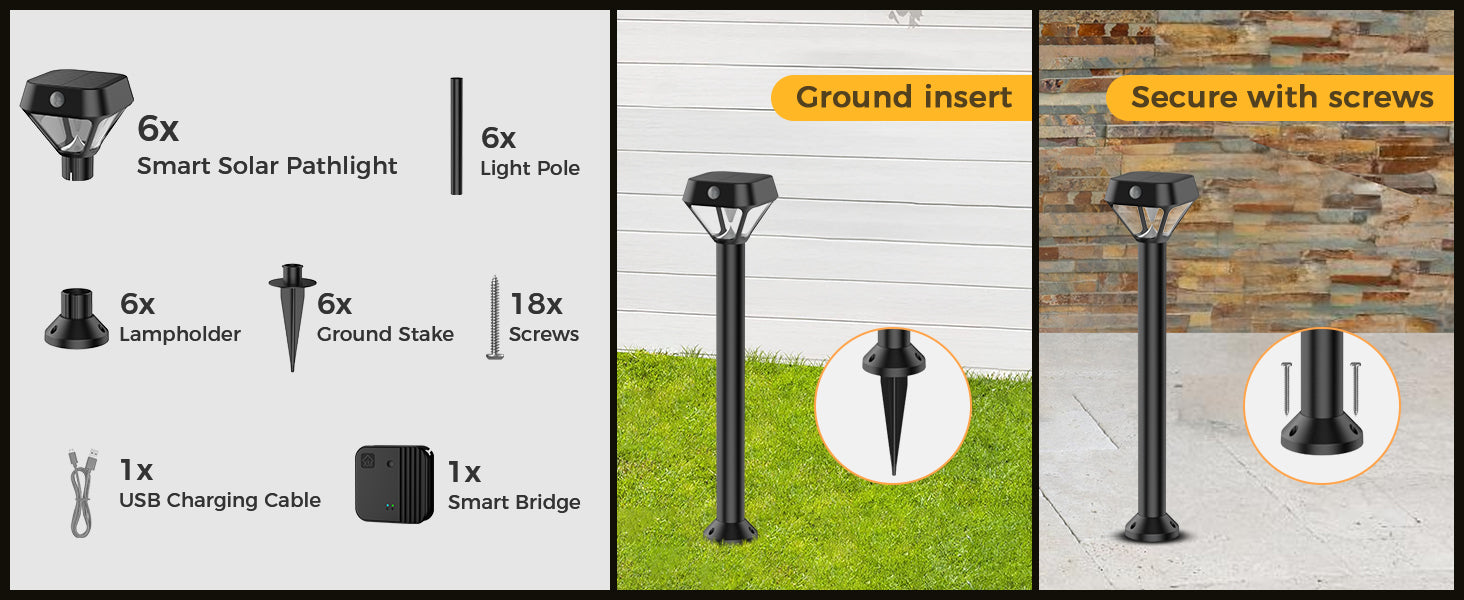 These are high-quality, multi-functional, solar-powered (rechargeable batteries included). XMCosy app controls the lights individually or as a group via the XMCosy Smart Bridge (included with 6-light package) and my home WIFI (2.5 GHz) router. It is easy to install and set up. I can either set specific days/times to turn lights on/off or use the built-in motion sensors (sensitivity adjustable) to turn them on/off (duration times adjustable), change the light colors/intensities and more. They include the hardware to either install them in a lawn or screw them into a wooden deck. I have them in my lawn around the perimeter of my patio and look great (see photos). XMCosy+ customer service is very responsive and stands behind their products.